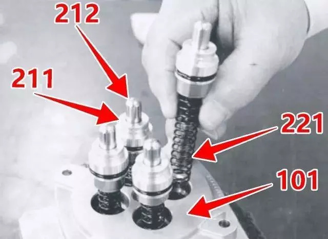 3、依次從殼體內(nèi)拆下推桿(212)、堵頭(211)、減壓閥總成(閥芯)、回位彈簧(221)。