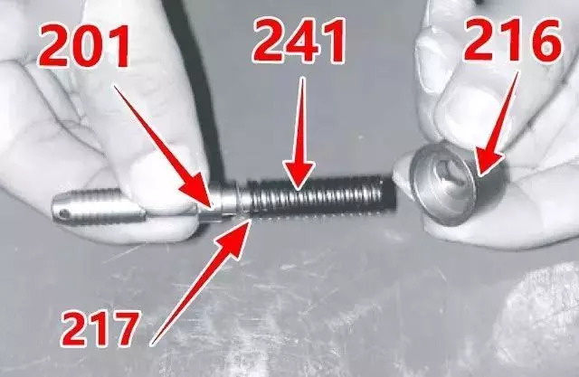 4、壓縮彈簧座(216),按壓彈簧(241),使閥芯(201)的頭部穿過彈簧座的打孔,將其拆下。