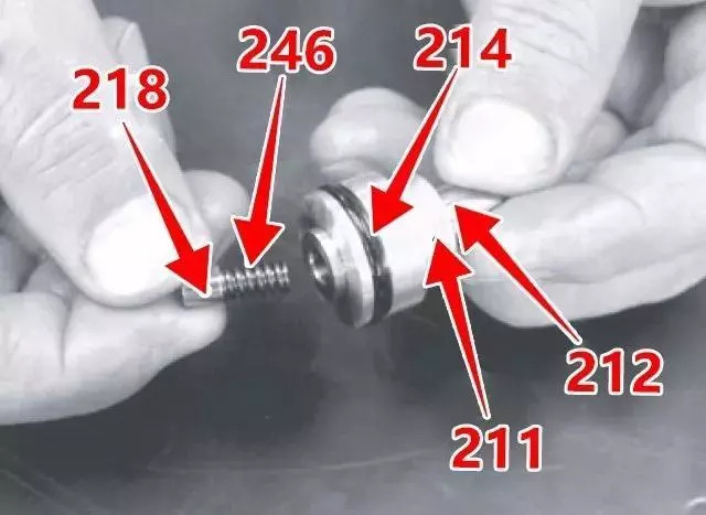 5、分離閥芯(201),彈簧座(216),彈簧(214),墊圈(217);從推桿(212)上拆卸彈簧(246),和彈簧座(218)。然后從堵頭(211)上拆下推桿(212)和O型圈(214)以及密封圈(213)。