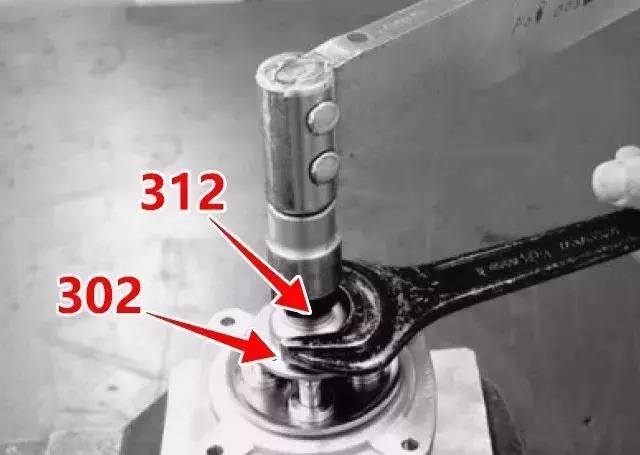 1、在先導(dǎo)閥各端口堵上堵頭后清洗先導(dǎo)閥,拆下防護(hù)罩的同時(shí)用扳手分別卡住調(diào)整螺母(312)和圓板(302),將螺母拆下來后,取下圓板。